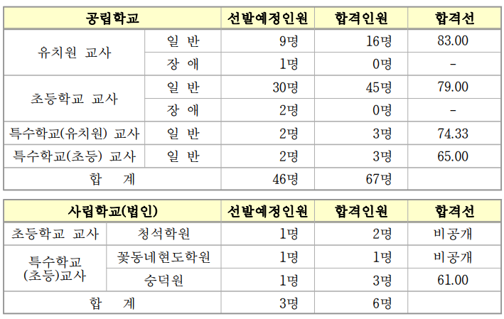 충청북도 교육청에서 선발하는 유치원・초등학교・특수학교(유치원・초등)임용고시 1차 시험 합격자는 공립 67명, 사립 6명입니다.