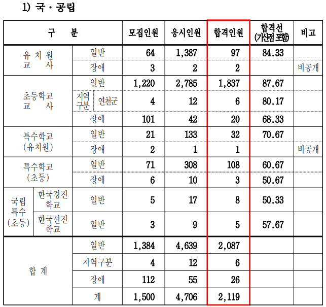 인천광역시 유·초등 임용시험 합격자 현황 및 합격선