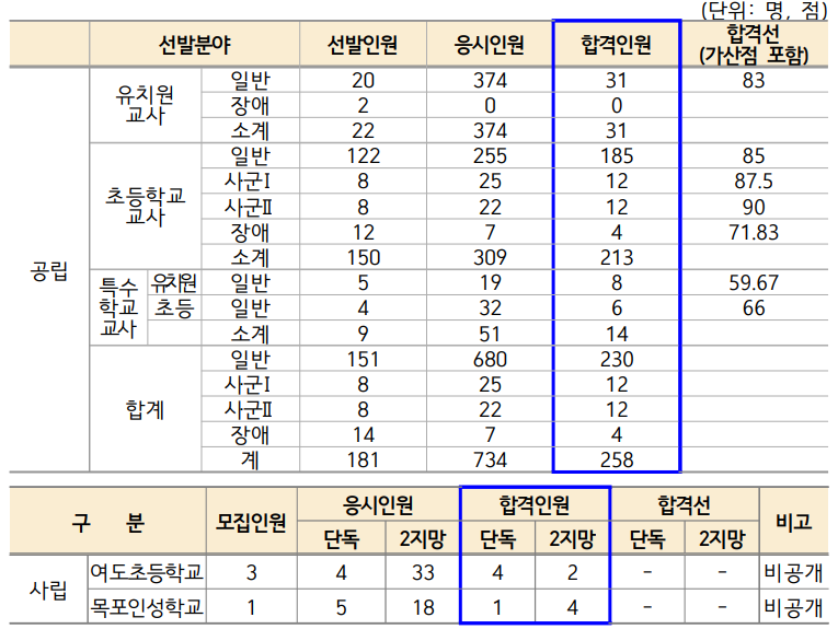 전라남도 유·초등 임용시험 합격자 현황 및 합격선