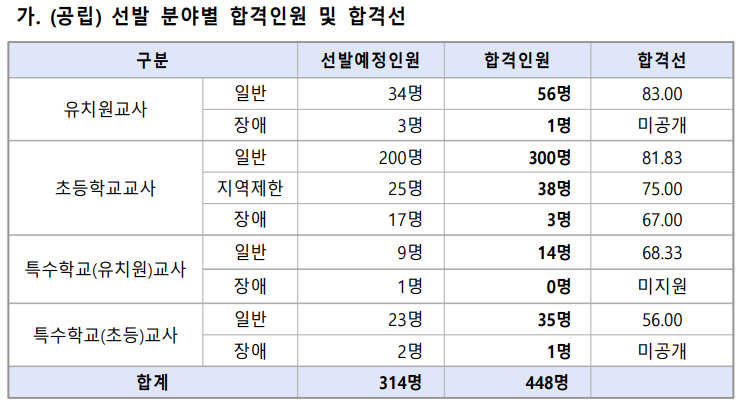 충청남도 교육청에서 선발하는 유치원・초등학교・특수학교(유치원・초등)임용고시 1차 시험 합격자는 448명입니다.