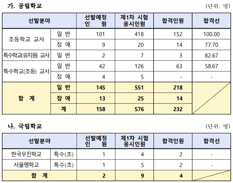 서울특별시 교육청에서 선발하는 유치원・초등학교・특수학교(유치원・초등)임용고시 1차 시험 합격자는 공립 232명, 국립 4명, 사립 45명입니다.