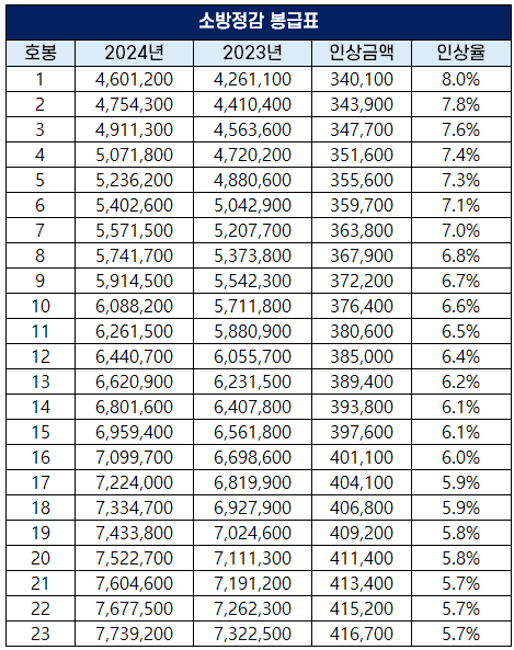 8.0%가 인상된 소방정감 1호봉은 봉급은 4,601,200원, 6.6%가 인상된 10호봉은 6,088,200원, 5.7%가 인상된 23호봉은 7,739,200원입니다.