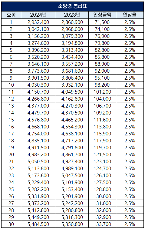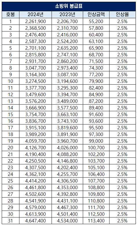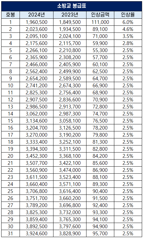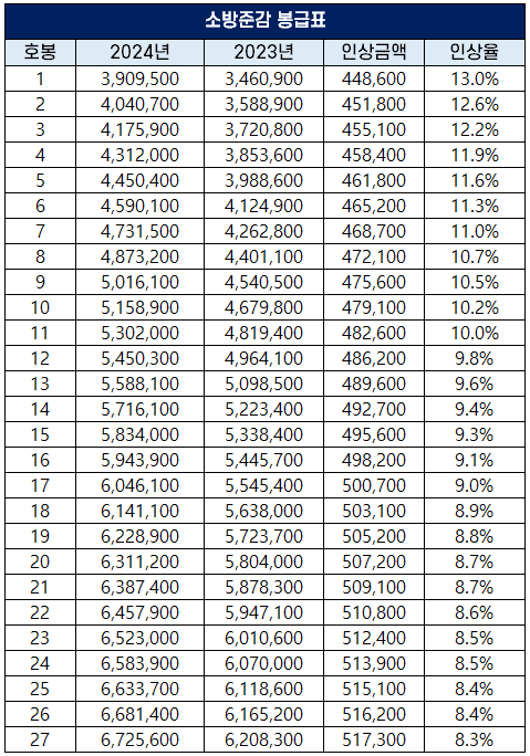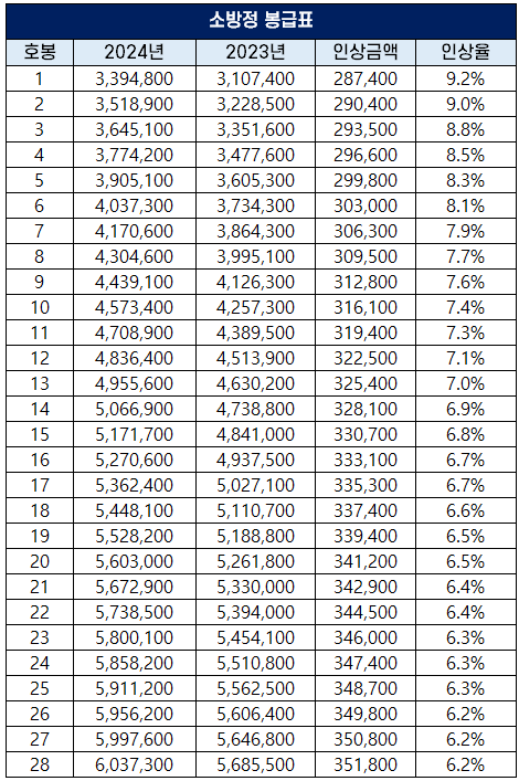 2024년 소방공무원 보수 인상률과 봉급표 개정