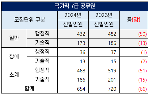 2024년 7급 국가공무원은 행정직에서 468명, 기술직에서 186명을 선발해 총 654명을 선발합니다.