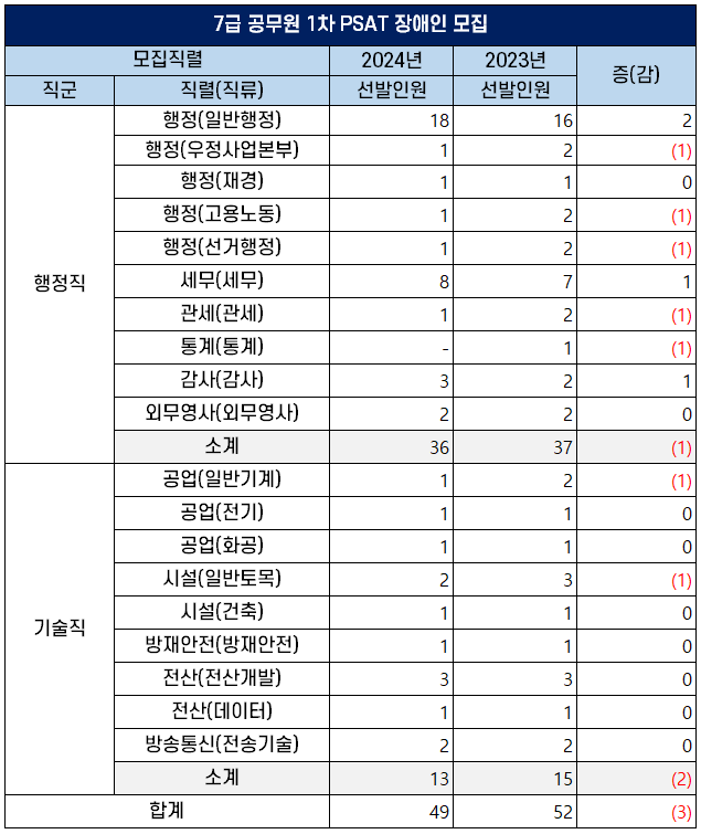 2024년 7급 국가직 공무원은 장애인 모집으로 행정직 36명, 기술직 13명을 선발해 총 49명을 모집합니다. 52명을 선발했던 지난해에 비해 모집인원이 3명이 줄었는데요. 행정직 티오는 1명, 기술직 티오는 2명이 감소했습니다.