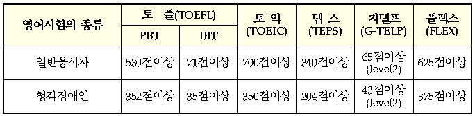 또한, 차량이나 신체 손해사정사가 재물손해사정사 2차 시험에 응시하는 경우에도 아래 표에 해당하는 영어시험 성적을 제출해야 합니다.