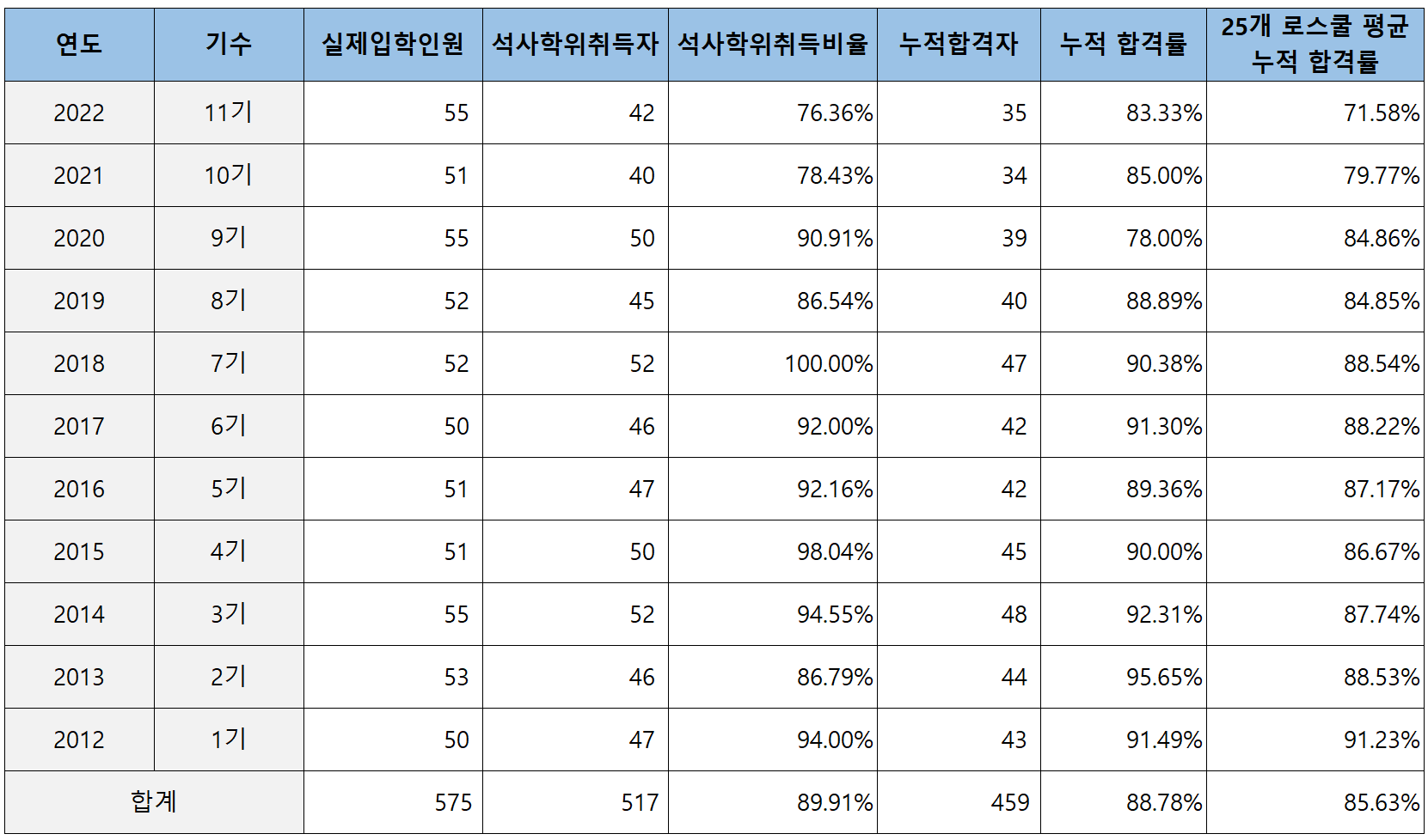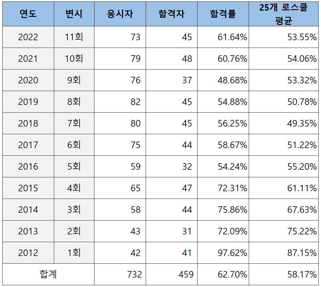 2012년 제1회부터 2022년 제11회까지 한국외대 로스쿨의 누적 석사학위 취득자 대비 변호사 시험 합격률은 아래 표와 같습니다.