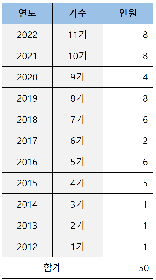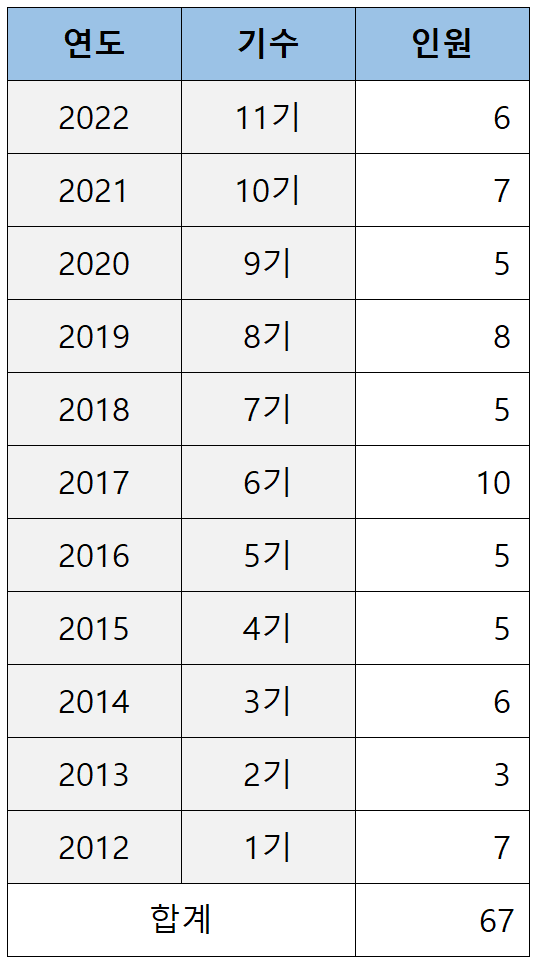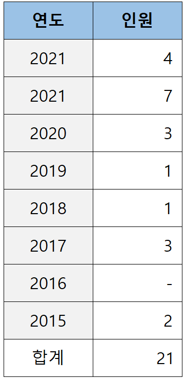 로스쿨 출신이 처음 검사로 임용되기 시작한 2012년(로스쿨 1기)부터 2022년(로스쿨 11기)까지 11년간 연세대 로스쿨이 배출한 검사는 아래 표와 같습니다.