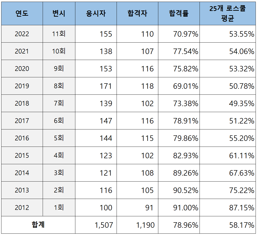 25개 로스쿨의 변호사시험 초시 합격률 현황과 순위가 궁금하시면 아래 링크를 클릭하시면 됩니다.