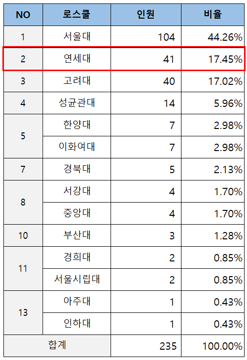 지난 11년간 총 50명의 로클럭을 배출한 연세대의 로클럭 누적 합격자 순위는 25개 로스쿨 중 6위에 해당합니다.
