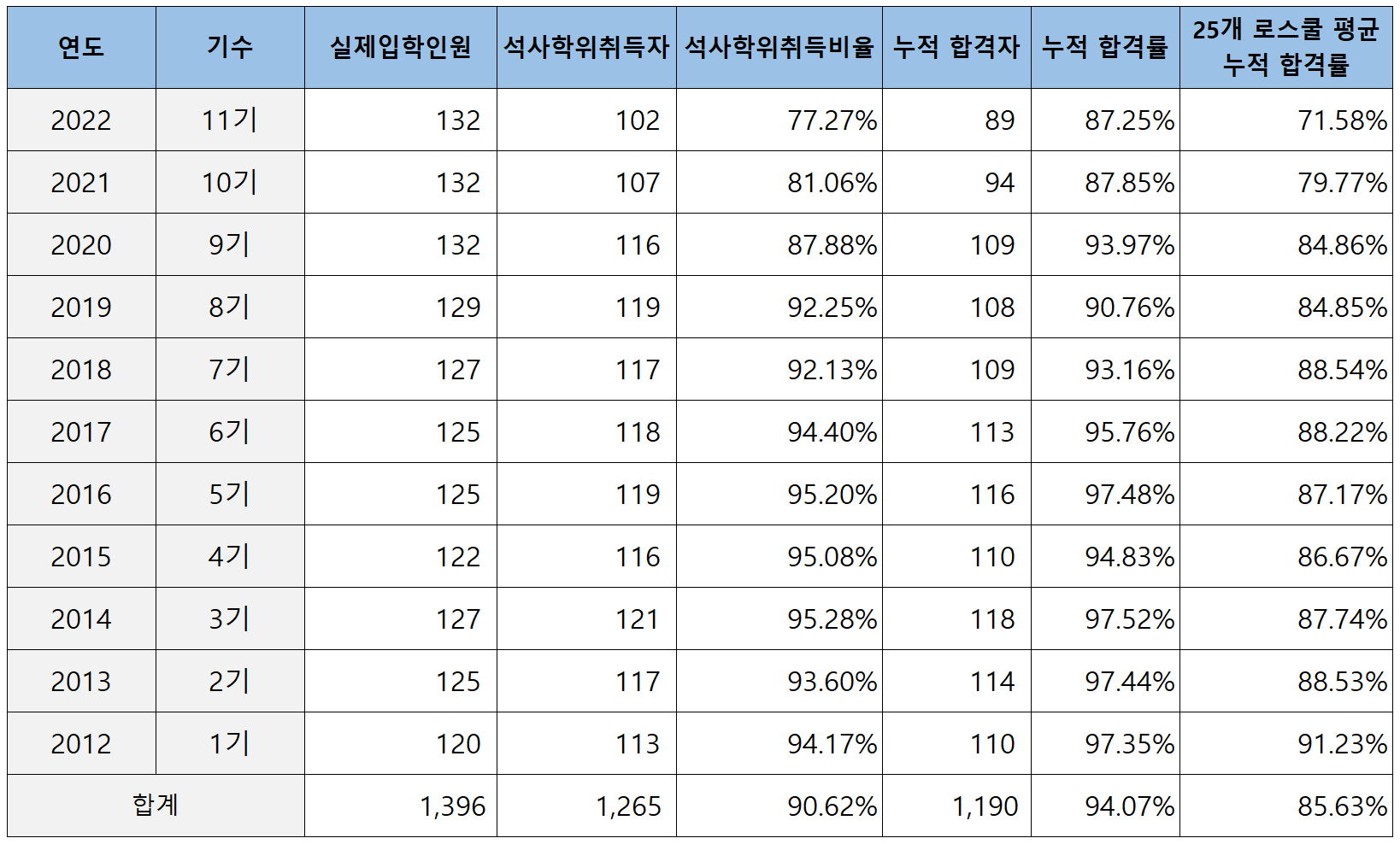 2012년부터 2022년까지 연세대 로스쿨의 총 입학생 1,396명 중 1,265명이 졸업하여 석사학위 취득비율은 90.62%이고, 1,265명의 졸업생 중 1,190명이 변호사 시험에 합격해 합격률은 94.047%입니다.