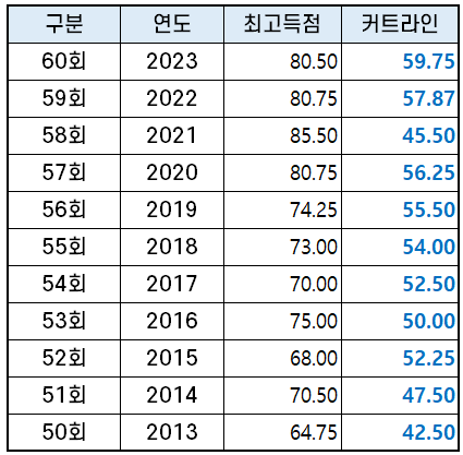 따라서 세무사 2차 시험은 합격을 결정하는 커트라인이 정해지는데 2021년 제58회 세무사 2차 시험 커트라인은 45.5점으로 크게 낮아졌고, 2023년 제60회 커트라인은 역대 가장 높은 59.75점을 기록했습니다.
