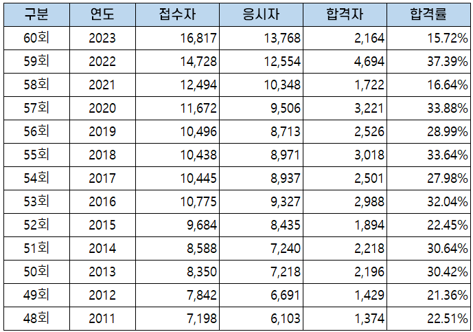 최근 합격률을 살펴보면 2022년에 37.39%로 높았고, 2023년에 15.72%로 낮아 난이도 편차가 컸습니다.