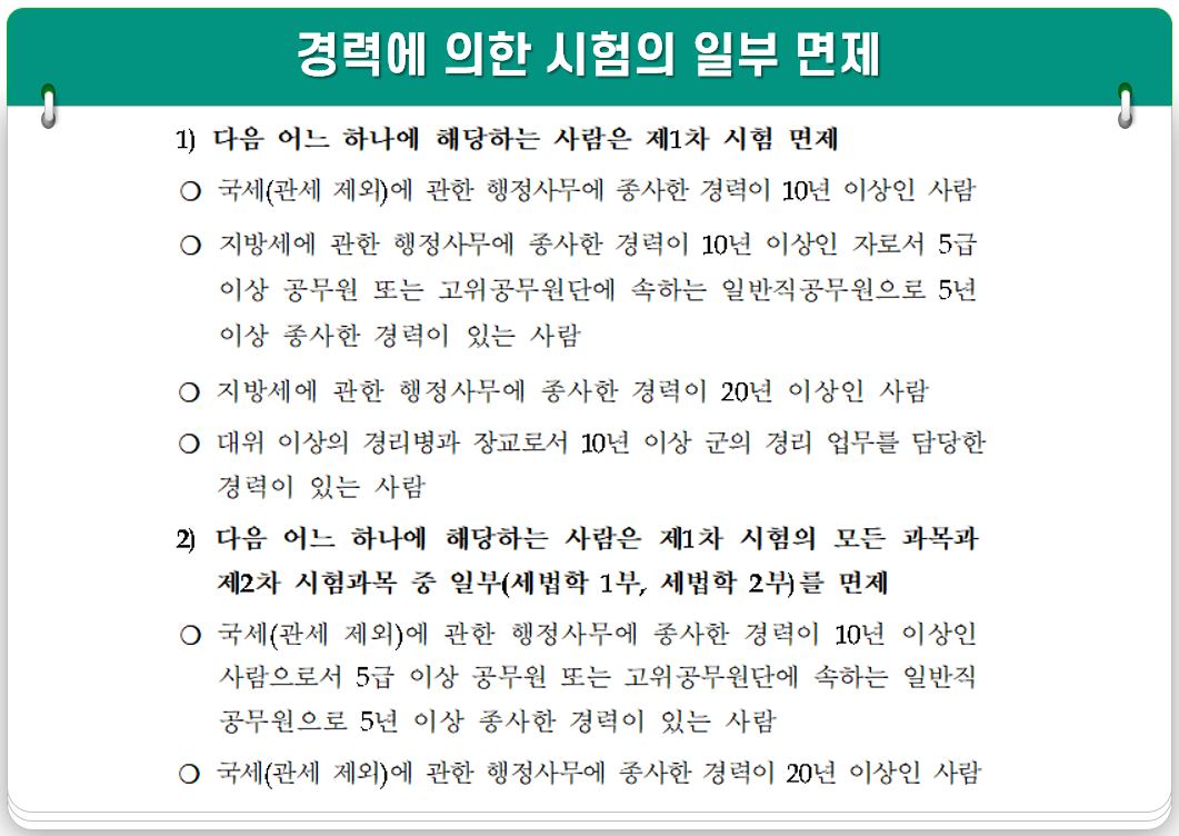 예전에는 국세청에서 사무관 이상으로 10년 이상 재직한 후 퇴직하면 세무사 자격이 주어지기도 했으나, 현재는 국세청 공무원으로 재직한 경험이 있는 사람은 근무 기간에 따라 1차 시험 면제 혹은 2차 시험 과목 일부를 면제해 주는 것으로 변경돼 모든 사람이 세무사 자격 시험을 거쳐야 세무사 자격증을 취득할 수 있습니다.