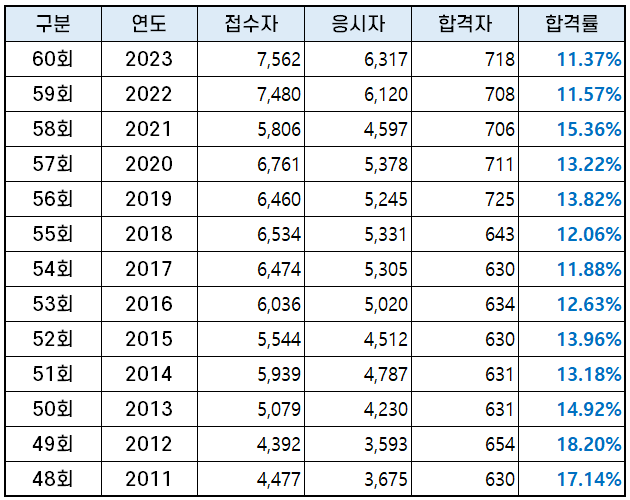 2018년 제55회 시험까지는 최소합격인원이 630명이었으나, 2019년 제56회 시험부터 700명으로 증가하여 2023년까지 유지되고 있습니다.