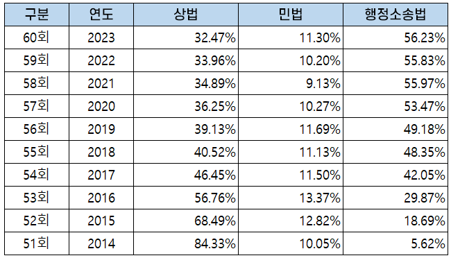 예전엔 상법을 선택하는 응시자가 가장 많았으나, 최근에는 법조문과 판례의 양이 적은 행정소송법을 선택하는 수험생이 더 많아졌습니다.
