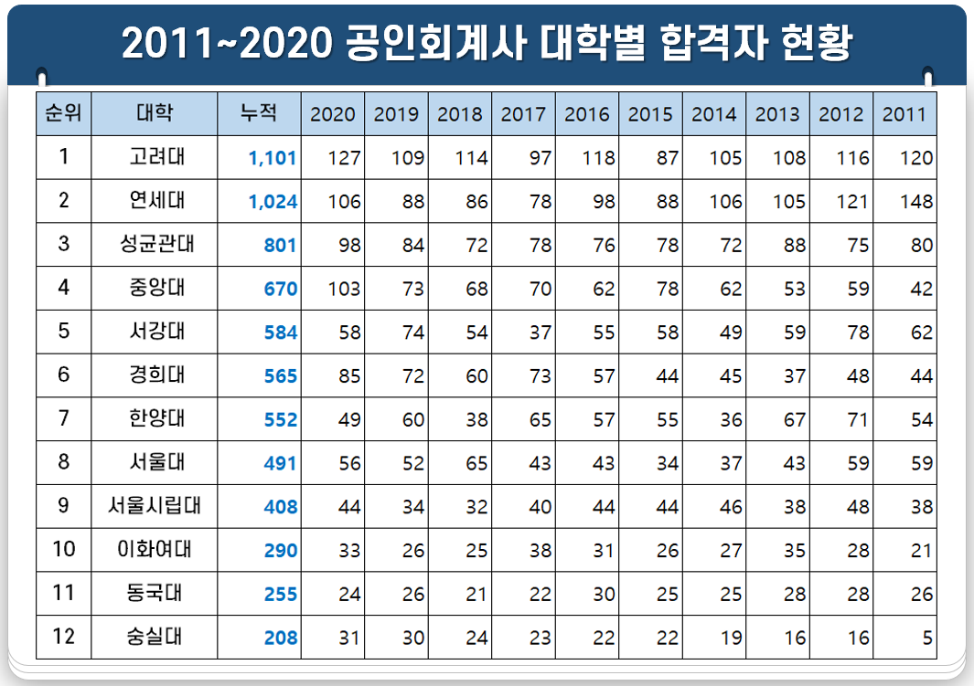 2011년부터 2020년까지 최근 10년간 대학별 CPA누적 합격자 수 순위는 아래와 같습니다.