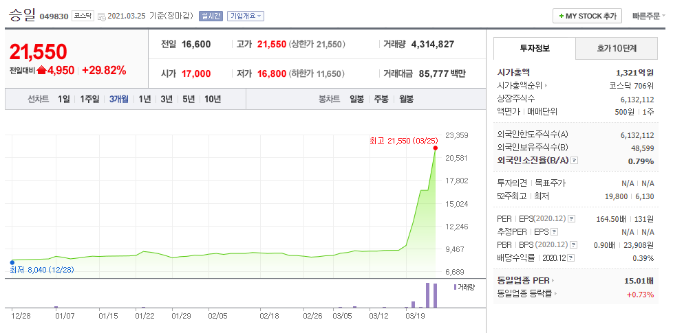 이유: 법무법인 케이씨엘 변호사인 안영률 사외이사가 윤석열 전 총장과 서울대 법대 동문. 윤석열 관련주의 대장주로 꼽히던 서연의 자회사로서 더 알려진 회사.