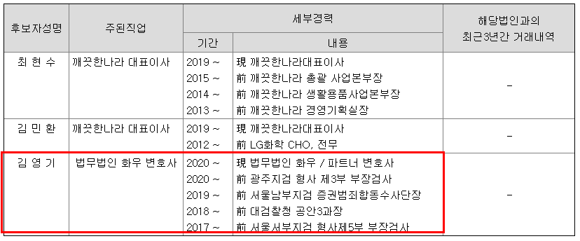 이유: 법무법인 태평양 변호사인 류광현 사외이사가 윤석열 전 총장과 서울대 법대 동문이자 연수원 23기 동기