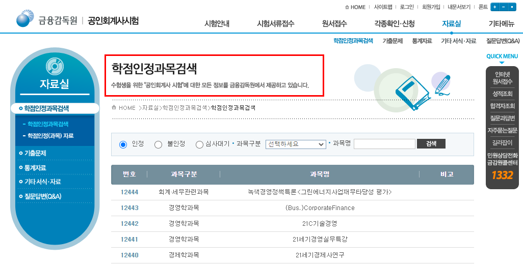 학점인정과목은 공인회계사 시험 홈페이지의 자료실>학점인정과목검색 코너에서 조회 가능합니다. 아래 그림을 클릭하면 바로 연결됩니다.