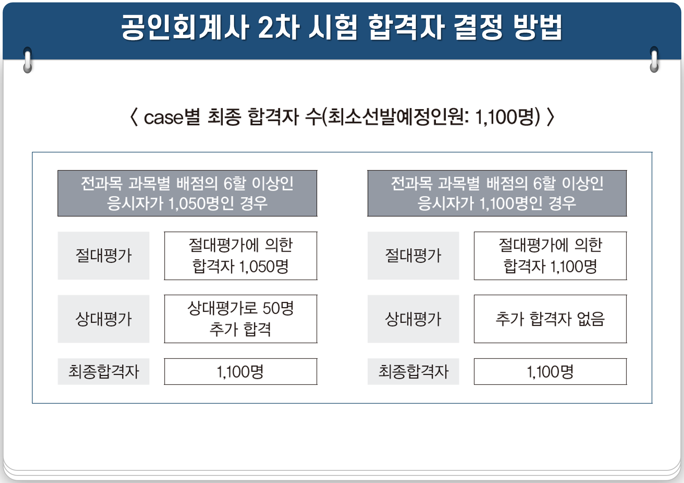 공인회계사 2차 시험은 매과목 배점의 6할 이상을 득점한 자를 합격자로 결정(절대평가)하되, 절대평가로 합격한 자가 최소 선발예정인원에 미달하는 경우 매과목 배점 4학 이상을 득점한 자 중 전과목 총득점에 의한 고득점자 순으로(상대평가) 미달인원만큼 합격자를 추가 결정합니다.