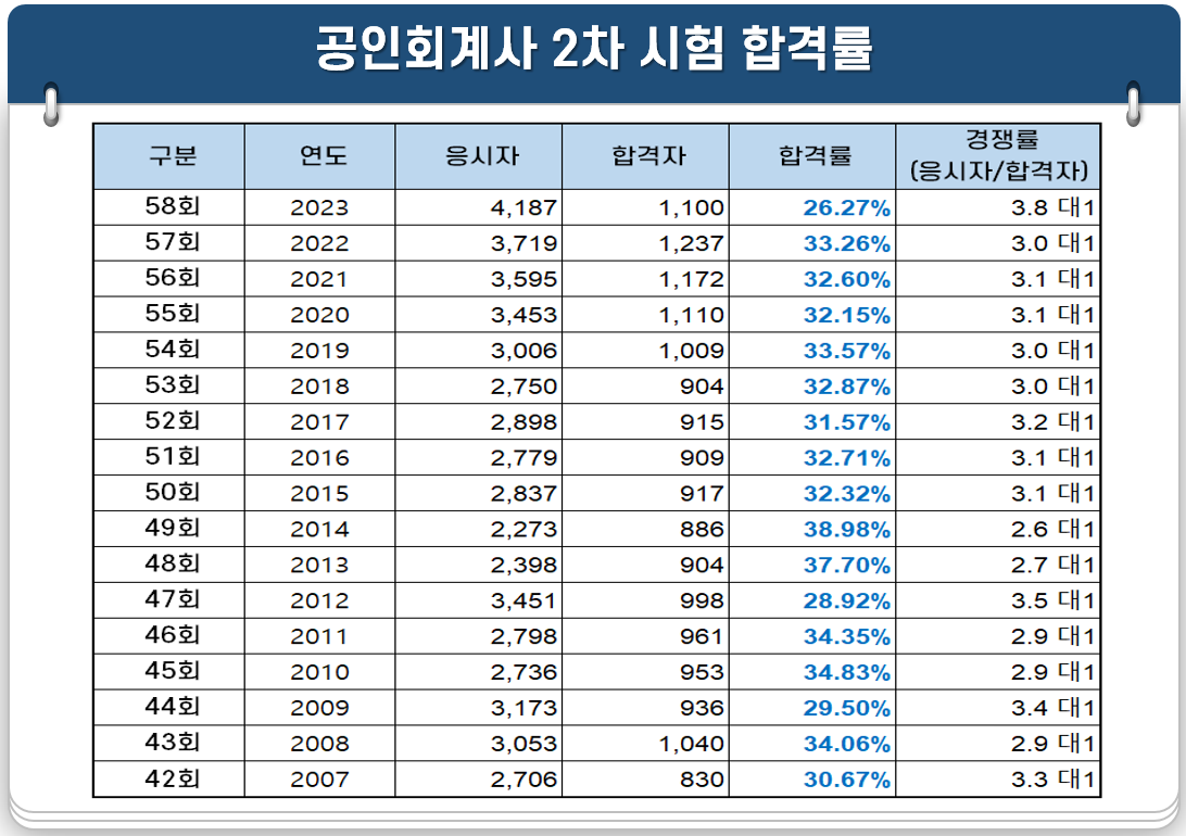 공인회계사 2차 시험의 합격률은 30%내외입니다.