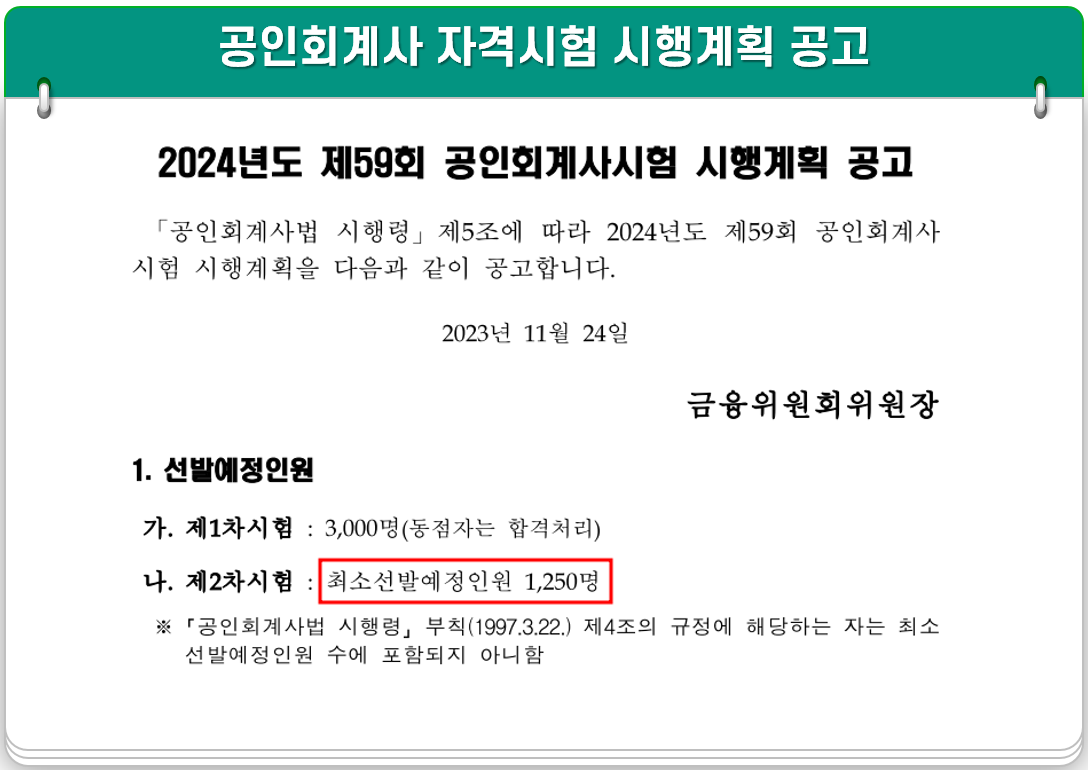 공인회계사 자격시험은 금융위원회가 매년 공고하는 최소 선발예정인원에 따라 합격자를 결정하고 있습니다.
