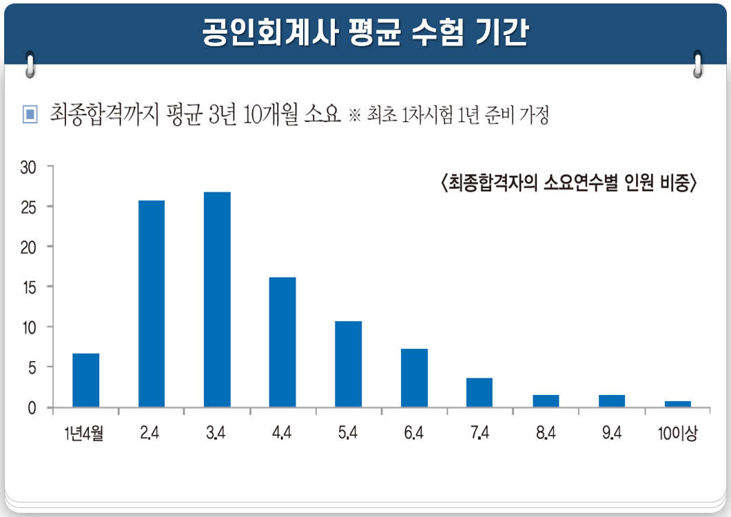 금융감독원이 2007년부터 2018년 응시자 및 합격자를 대상을 조사한 통계에 의하면 공인회계사 시험 최종합격까지 평균 수험 기간은 3년 10개월이 소요되는 것으로 나타났습니다.