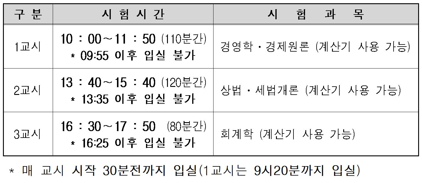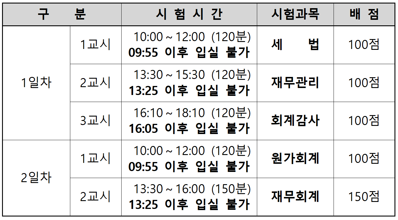 1교시 | 세법 | 100점 | 10:00~12:00 (120분) |