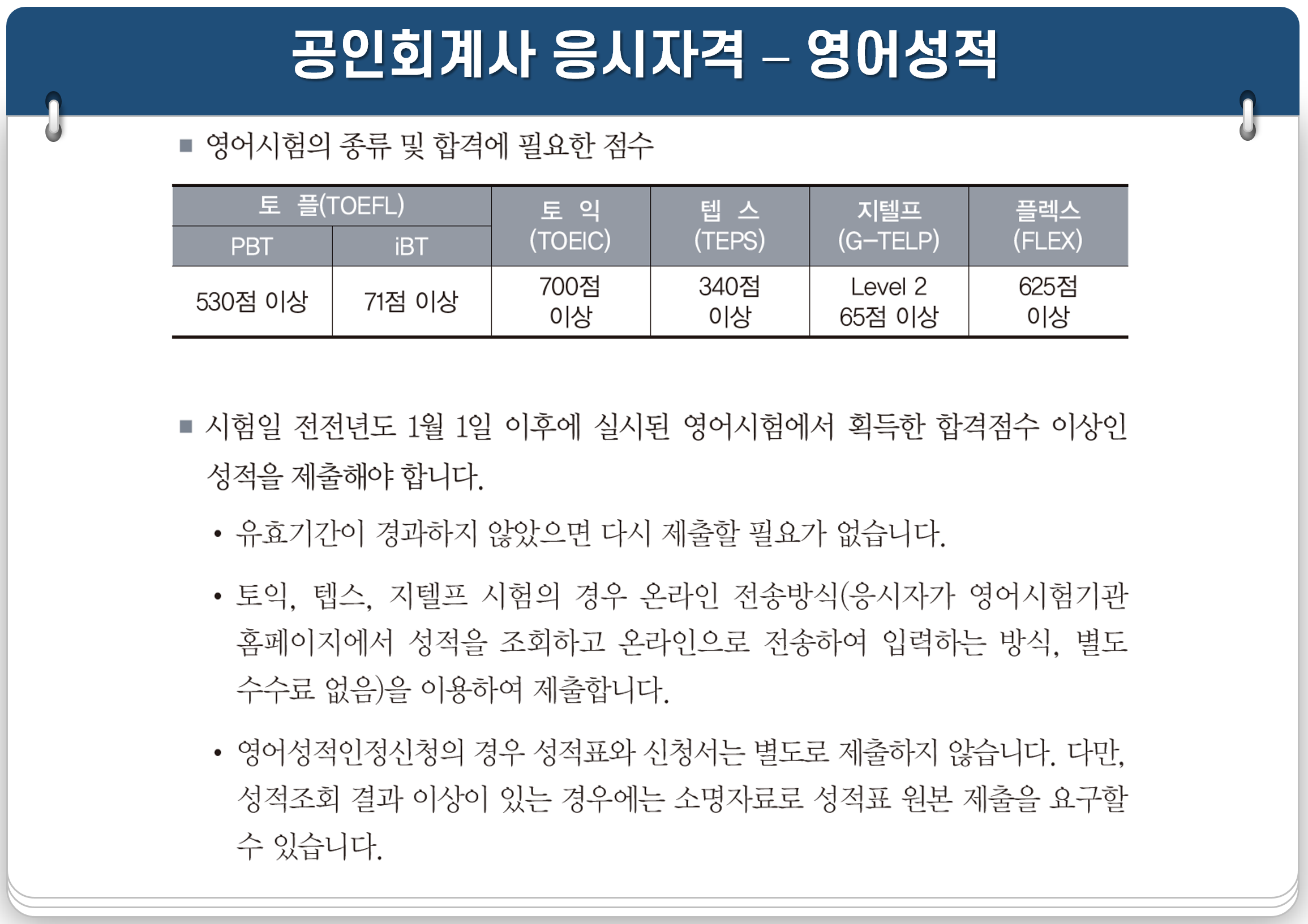 공인회계사 시험은 1차 시험의 영어 과목을 공인 영어시험성적 제출로 대체하고 있기 때문에 공인회계사 시험에 응시하기 위해서는 반드시 공인 영어 시험 성적이 필요합니다.