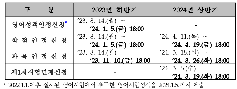 공인회계사 시험에 응시하기 위해서는 응시자격 요건 구비를 위해 학점인정 및 영어성적 인정 신청을 해야 하는데요. 통상 아래 일정표에 따라 진행하며, 구체적인 일정은 공인회계사 시험 사이트를 통해 수시로 확인하시기 바랍니다.