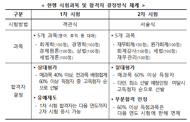 변경된 공인회계사 시험 제도에서도 응시자격요건인 사전 학점이수제도, 1차 시험은 상대평가, 2차 시험은 절대평가와 부분합격제라는 기존 시험 제도의 큰 틀은 그대로 유지됩니다.