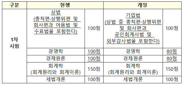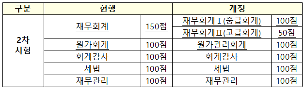 - 과목 배점 상향 조정: 1차 회계학과 2차 재무회계 과목의 배점을 100점에서 150점으로 상향 조정