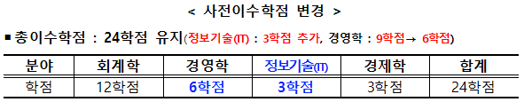 2025년부터는 사전 이수학점에 IT(정보기술) 과목 3학점이 추가되고, 대신 수험생 부담을 감안해 경영학 이수학점은 9학점에서 6학점으로 변경됩니다.