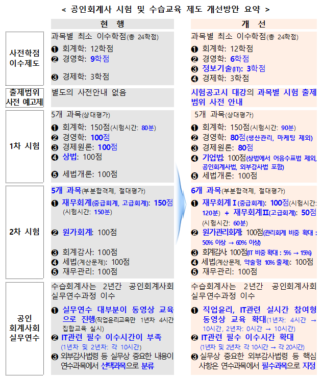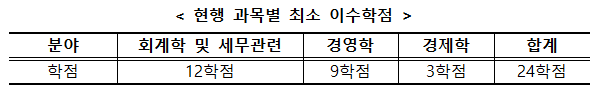 - 사전 학점이수제 도입- 회계학·세무 관련 과목 12학점, 경영학 과목 9학점, 경제학 과목 3학점 이상, 합계 24학점 이상을 이수해야 CPA 시험 응시 가능