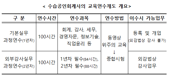 또한 IT역량을 갖춘 회계사를 육성하기 위해 IT 관련 필수 이수시간을 단계적으로 확대합니다(현행 1년차 10시간, 2년차 10시간 → 개정 1년차 20시간, 2년차 20시간).