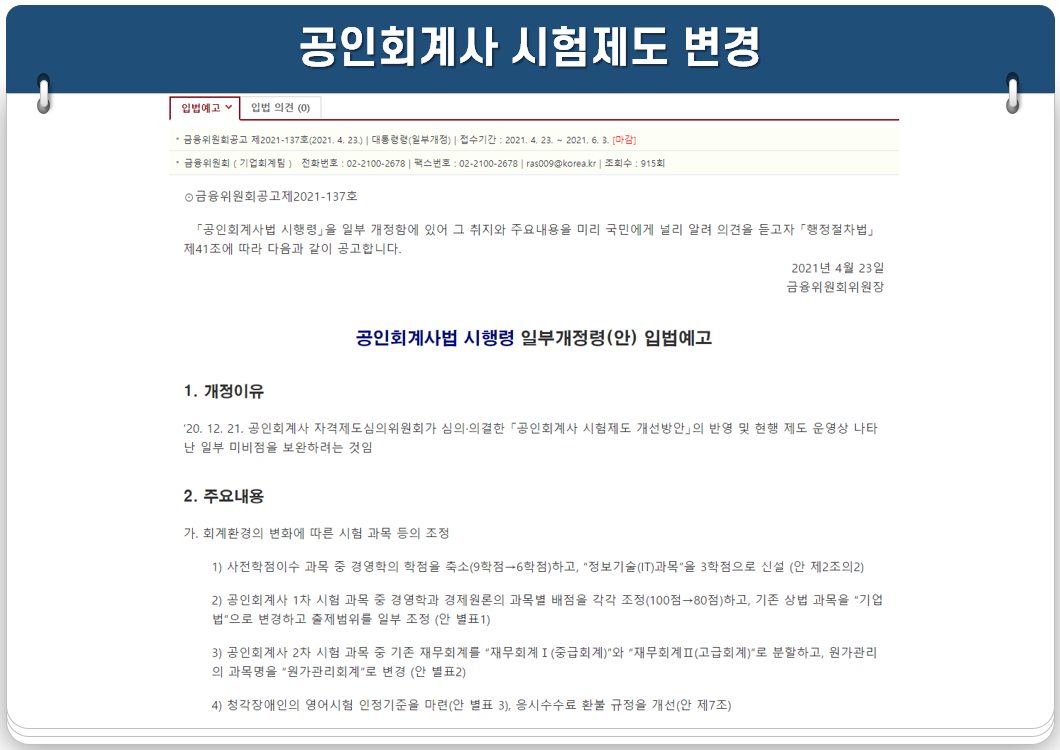 금융위원회의 공인회계사 시험 개선 방안의 시행을 위해 2021년 상반기 공인회계사법 시행령 등 관련 법령이 개정되었고, 개정된 공인회계사법 시행령은 입법예고를 마쳤습니다.