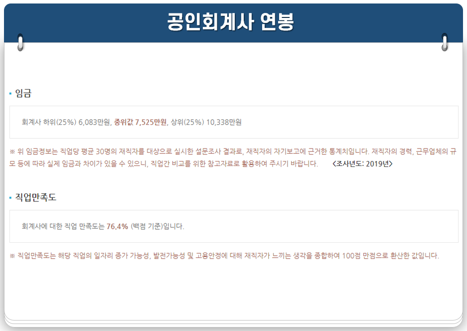 한국고용정보원에 따르면 공인회계사의 평균 연봉은 7,525만 원이고, 상위 25%는 10,338만 원, 하위 25%는 6,083만 원입니다.