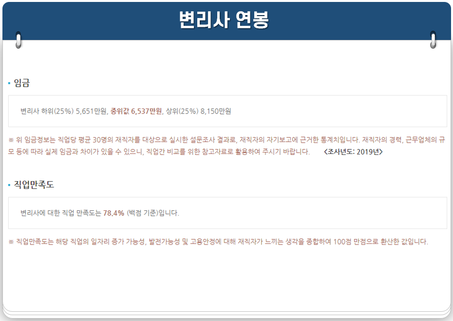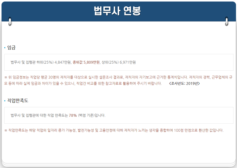 한국고용정보원에 따르면 법무사의 평균 연봉은 5,809만 원이고, 상위 25%는 6,971만 원, 하위 25%는 4,847만 원입니다.