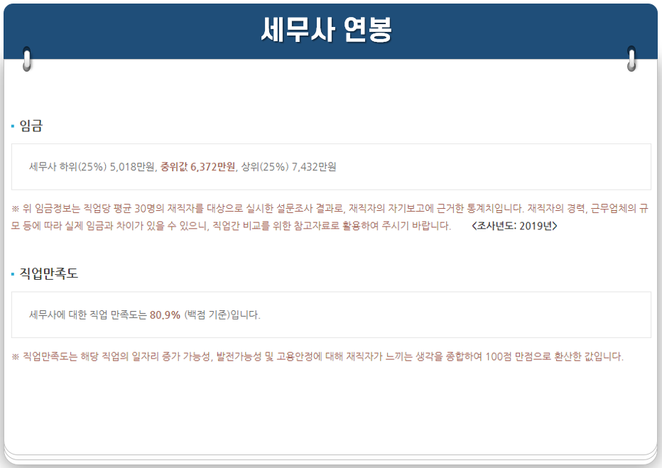 한국고용정보원에 따르면 세무사의 평균 연봉은 6,372만 원이고, 상위 25%는 7,432만 원, 하위 25%는 5,018만 원입니다.