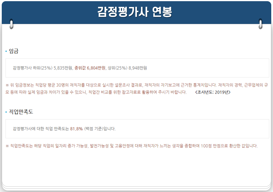 한국고용정보원에 따르면 감정평가사의 평균 연봉은 6,804만 원이고, 상위 25%는 8,948만 원, 하위 25%는 5,835만 원입니다.
