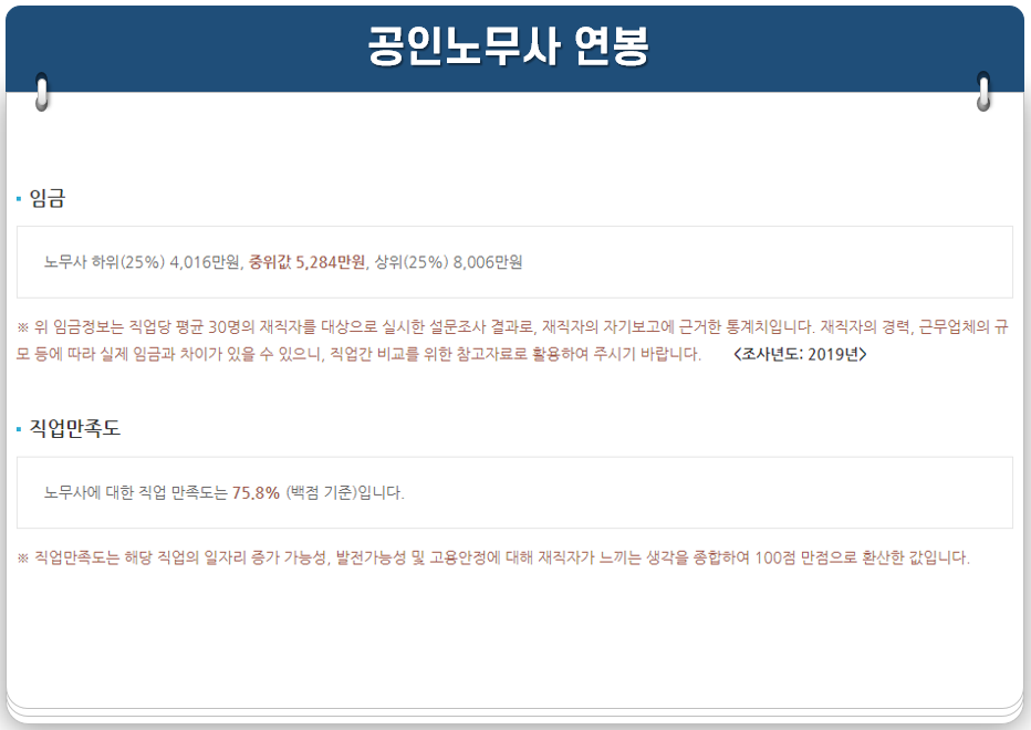 한국고용정보원에 따르면 공인노무사의 평균 연봉은 5,284만 원이고, 상위 25%는 8,006만 원, 하위 25%는 4,016만 원입니다.