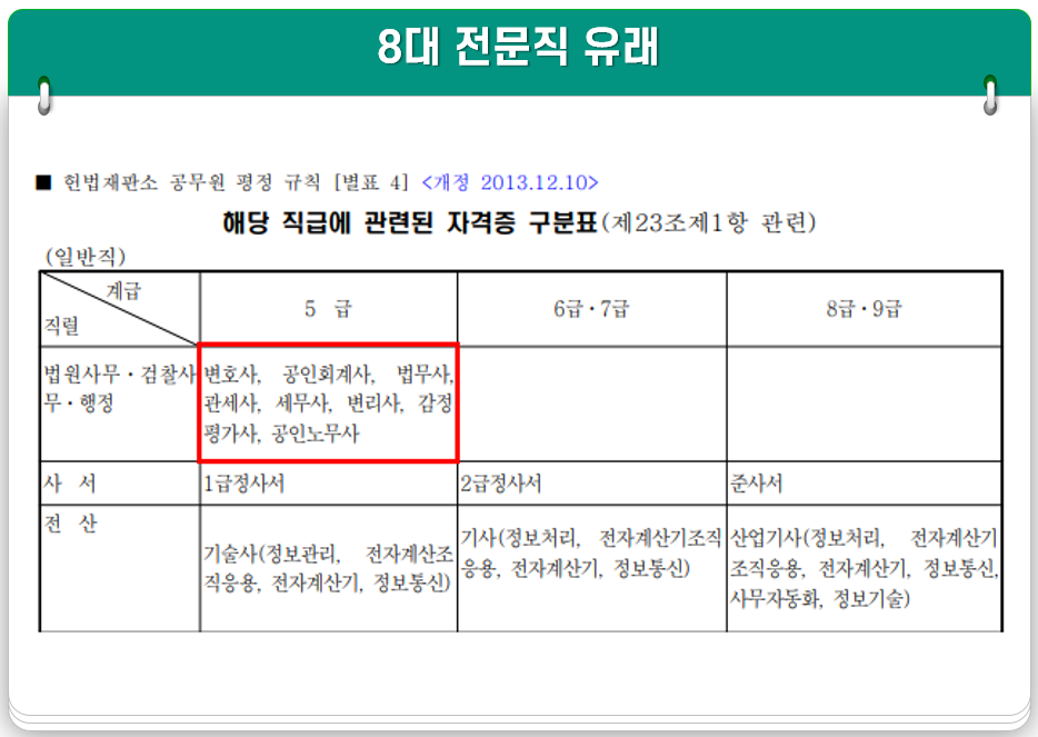 두 번째는 「헌법재판소 공무원 평정 규칙」에 5급 이상 사무관 진급 시 가산점을 주는 8개의 자격증이 그 유래라는 설입니다.