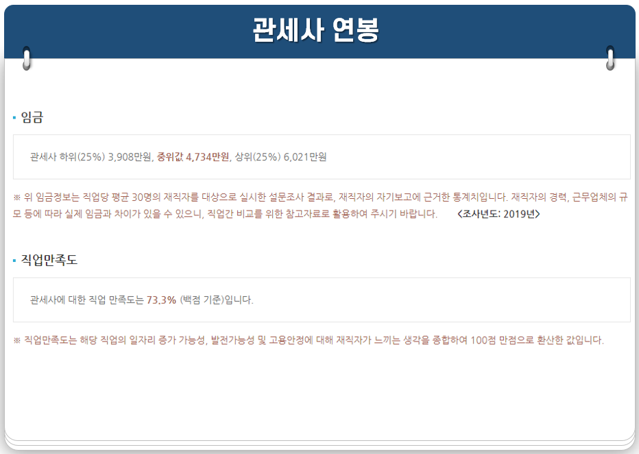 한국고용정보원에 따르면 관세사의 평균 연봉은 4,734만 원이고, 상위 25%는 6,021만 원, 하위 25%는 3,908만 원입니다.