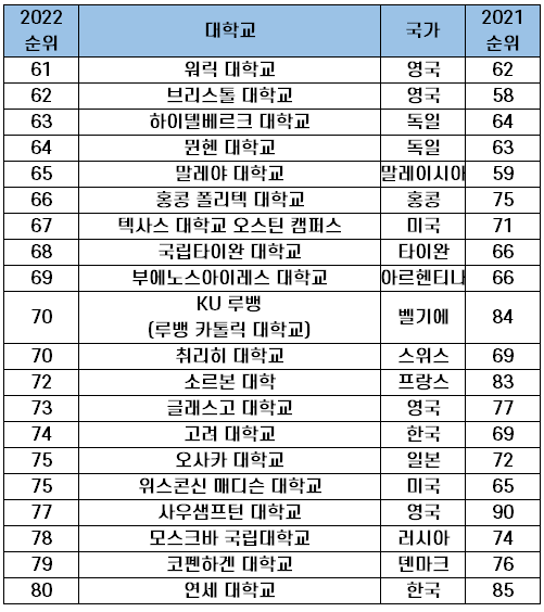 | 80 | 연세 대학교 | Yonsei University | 한국 | 85 |