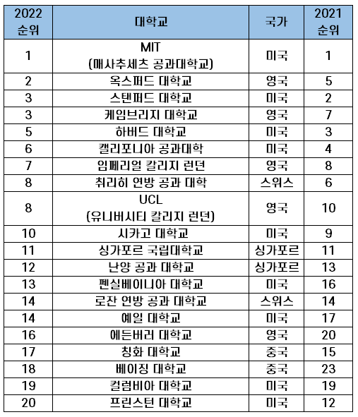 2022 QS 세계 대학 순위 1위부터 100위까지