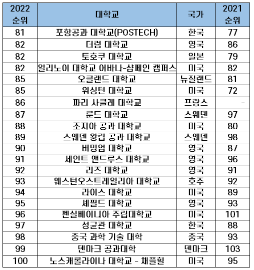 | 81 | 포항공과 대학교(POSTECH) | Pohang University of Science and Technology | 한국 | 77 |
