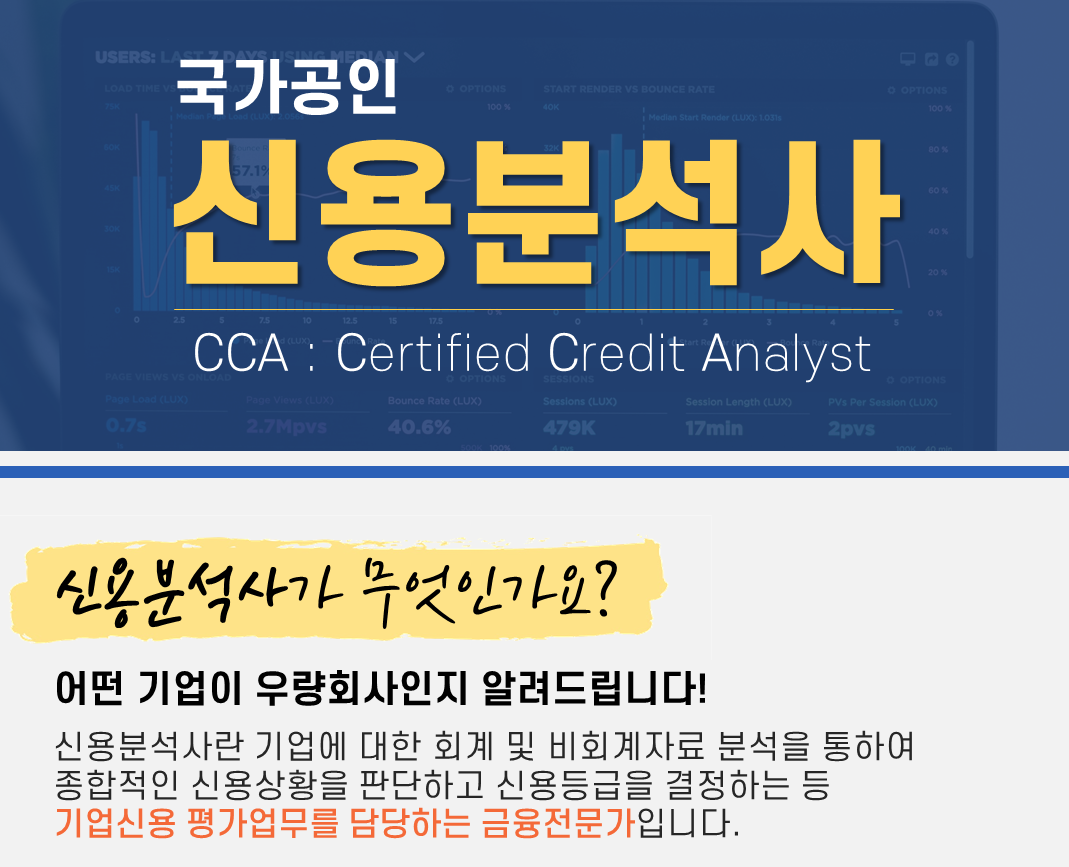 신용분석사(CCA, Certified Credit Analyst)는 금융기관에서 기업에 대한 회계 및 비회계 자료 등을 분석하여 종합적인 신용상황을 판단하고 신용등급을 결정하는 금융전문가입니다. 쉽게 말해 기업 대출 실행 여부를 결정하기 위해 기업의 신용을 평가하는 일을 하는 것입니다.