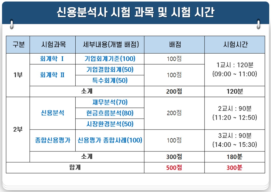 1부 시험은 회계학Ⅰ과 회계학 Ⅱ 과목을 총 120분 동안, 2부 시험은 과목별로 시험 시간을 나누어 신용분석 90분, 종합신용평가 90분 동안 시험 시간이 나누어집니다.