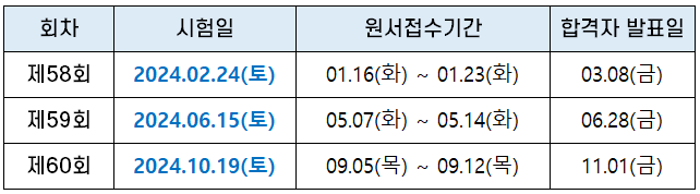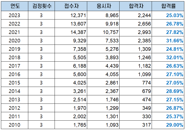 | 연도 | 검정횟수 | 접수자 | 응시자 | 합격자 |